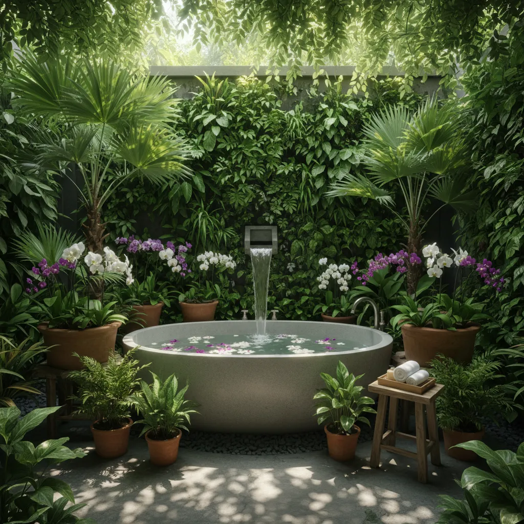 Turn your outdoor bathroom into a tropical escape by incorporating plenty of greenery. Use potted plants, hanging ferns, or even a vertical garden to surround your space with nature.