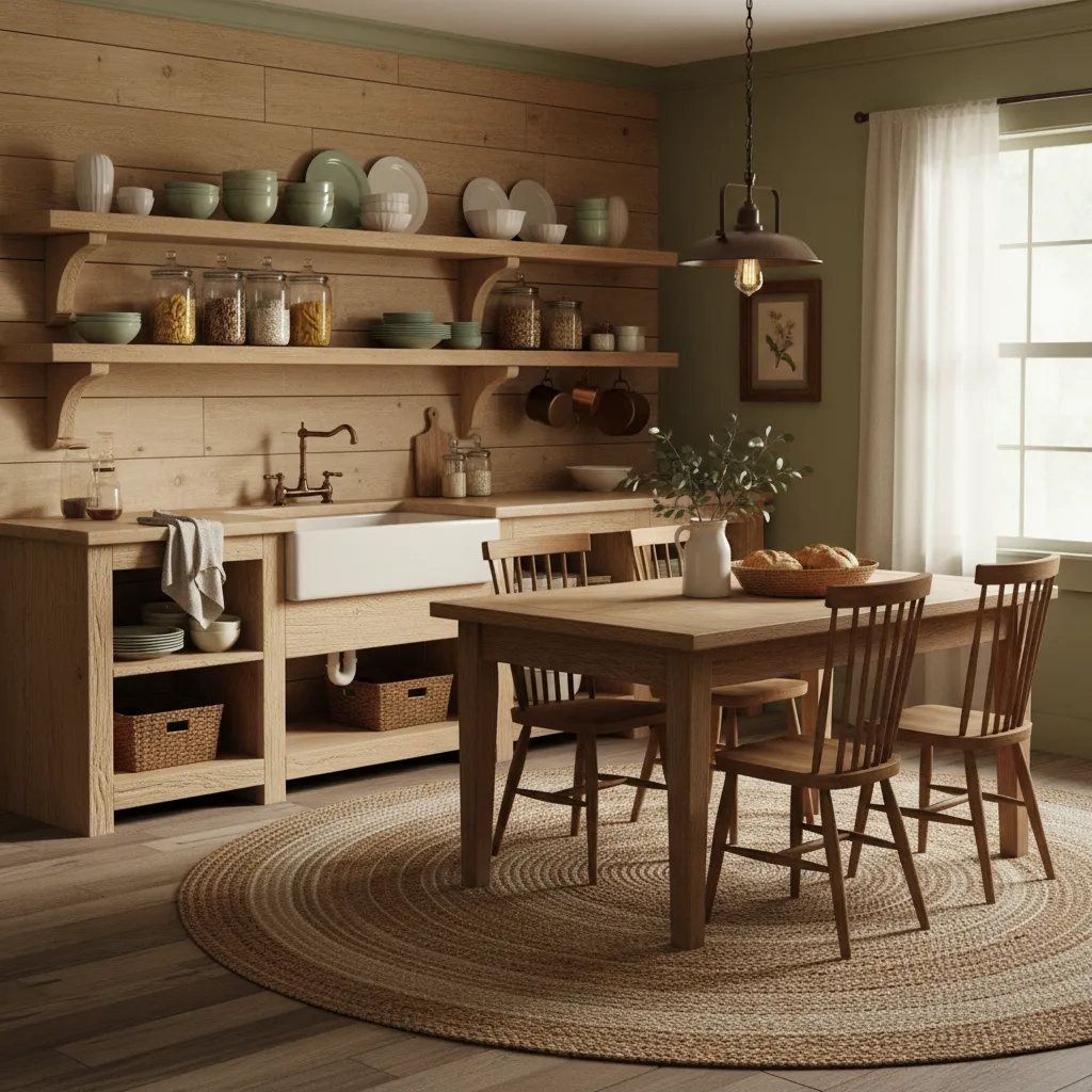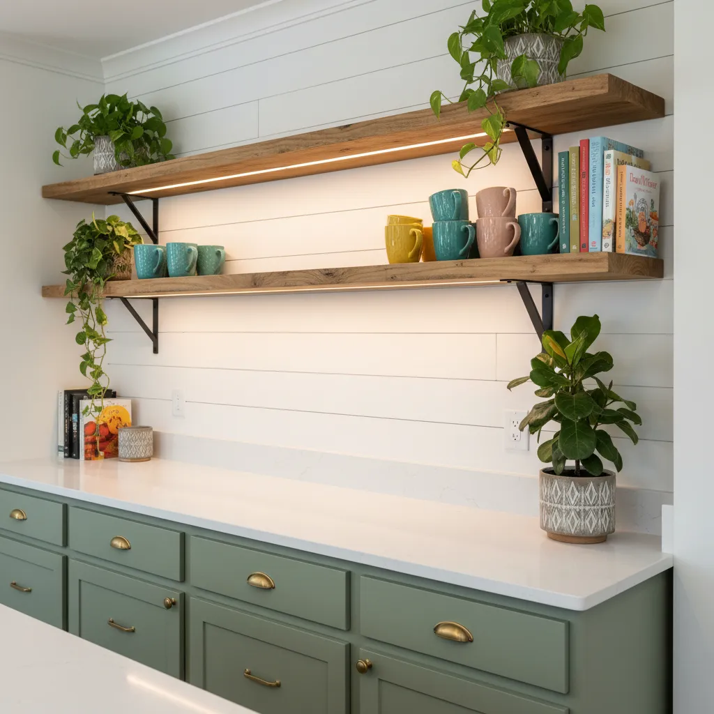 Pair shiplap with warm wood tones, open shelving, rustic lighting, and neutral or muted color palettes. Layering textures with countertop accessories and decorative accents enhances the cozy vibe.