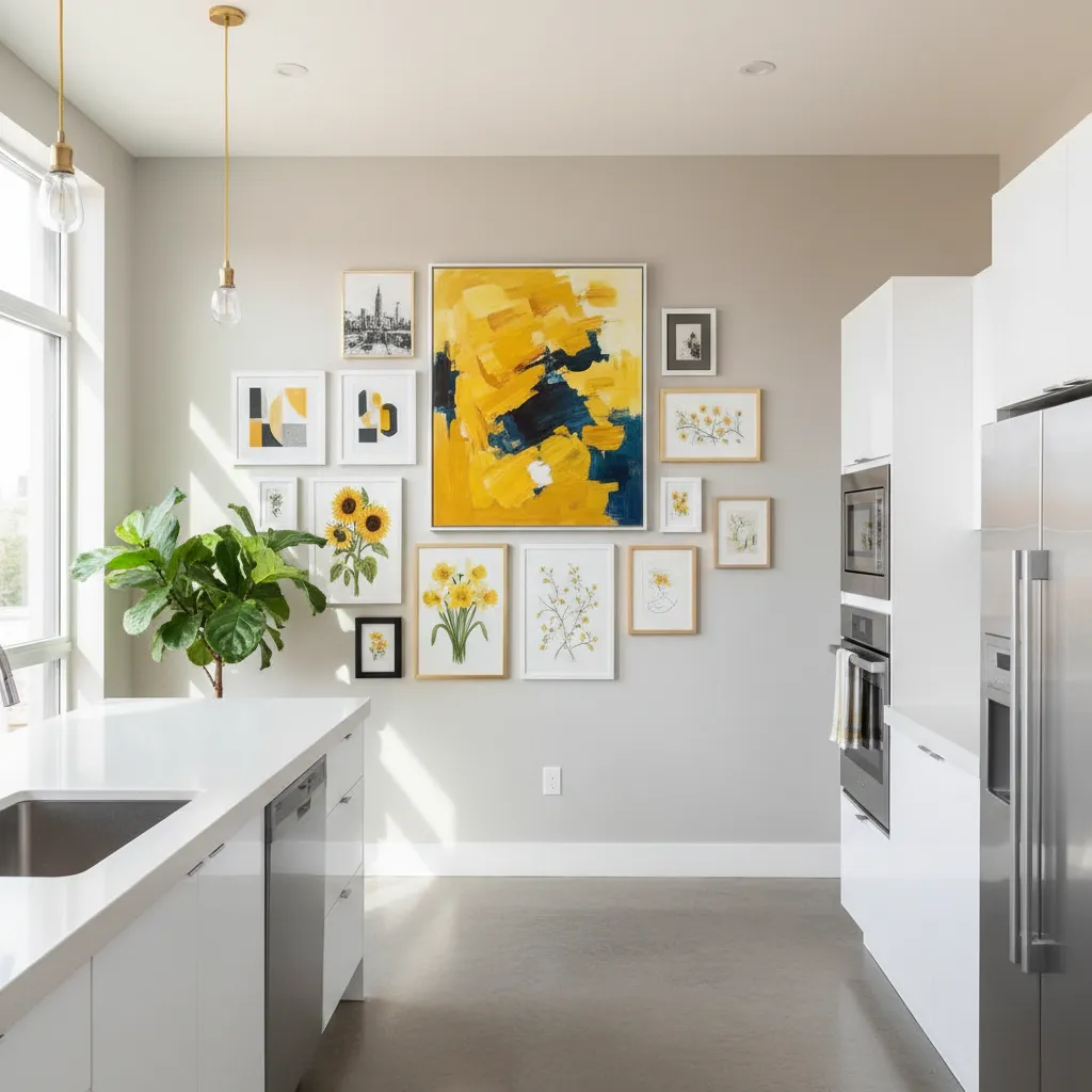 Art is a personal and powerful way to express your style. A gallery wall featuring prints with yellow accents, a large abstract canvas, or even charming botanical illustrations of yellow flowers can complete your kitchen’s look.