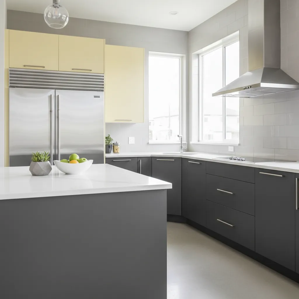For a more modern and refined look, pair yellow with gray. The coolness of gray balances the warmth of yellow beautifully. Consider charcoal gray lower cabinets with a pale yellow upper cabinet or a mustard yellow island in a gray-toned kitchen.