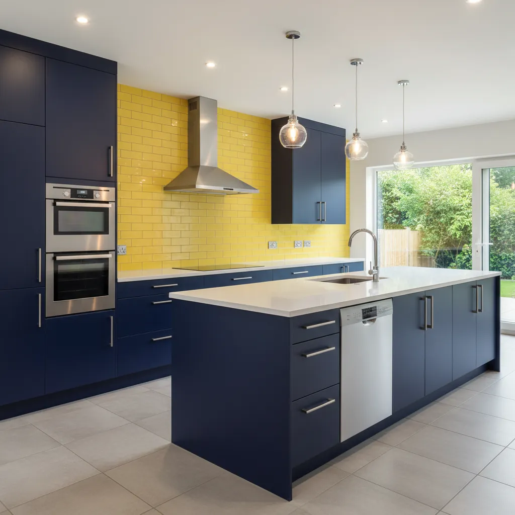 This high-contrast combination is dramatic and confident. Navy blue provides a deep, rich base that makes yellow accents pop. Try navy cabinets with a bright yellow backsplash or yellow bar stools at a navy island for a striking effect.