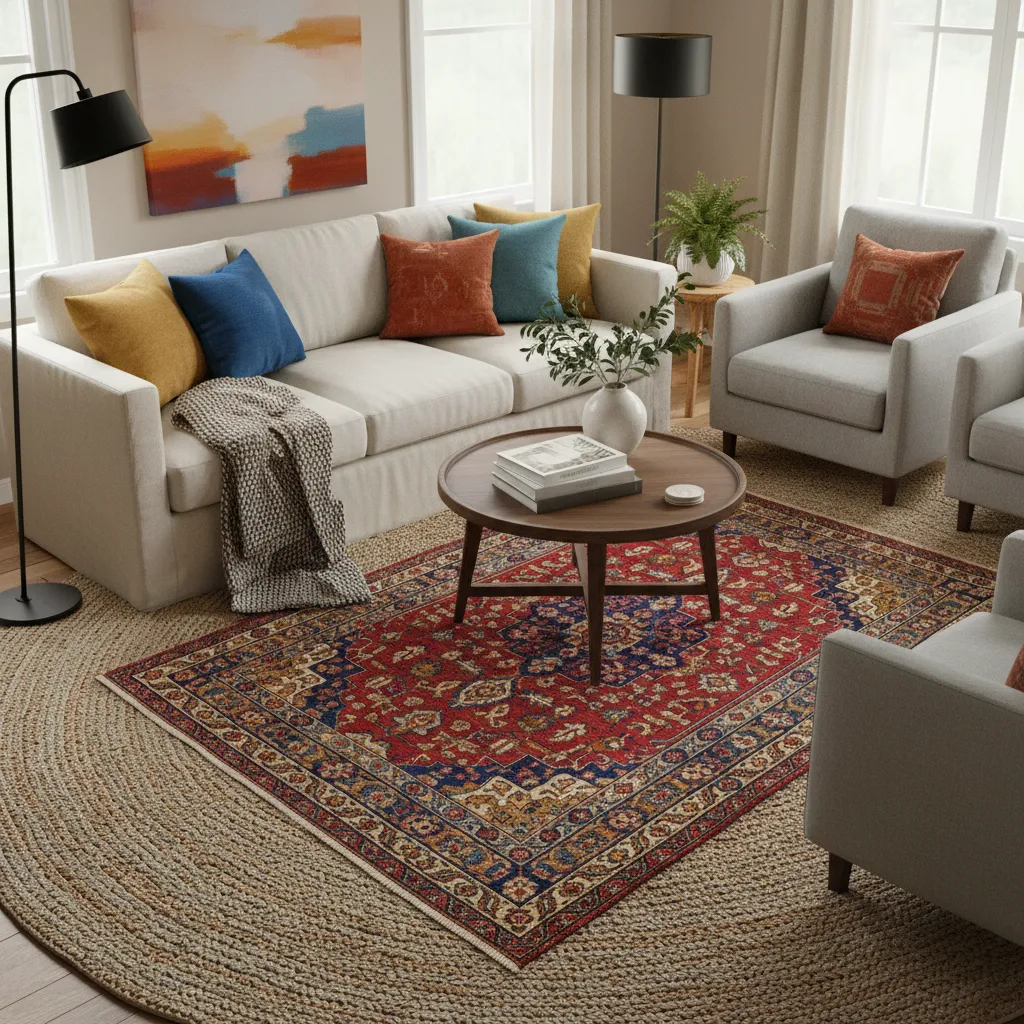 You do not have to settle for just one rug. Layering rugs is a classic designer trick that adds depth and comfort to the floor. Start with a large, flat-weave rug (like a natural jute or sisal) as your base. Then, place a smaller, softer rug (like a vintage Persian or a faux sheepskin) on top. This defines your seating area while doubling the texture.