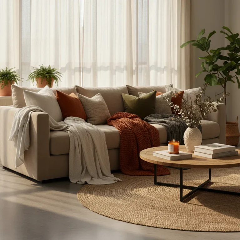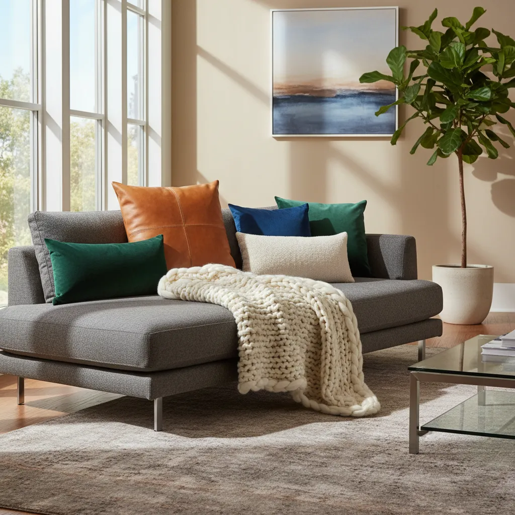 Do not buy a matching set of throw pillows. Instead, mix different fabrics to create a rich, inviting sofa arrangement. Pair a smooth leather pillow with a soft velvet one, and add a nubby bouclé or chunky knit throw blanket. This variety makes your couch look like a custom, curated collection rather than a basic furniture showroom.