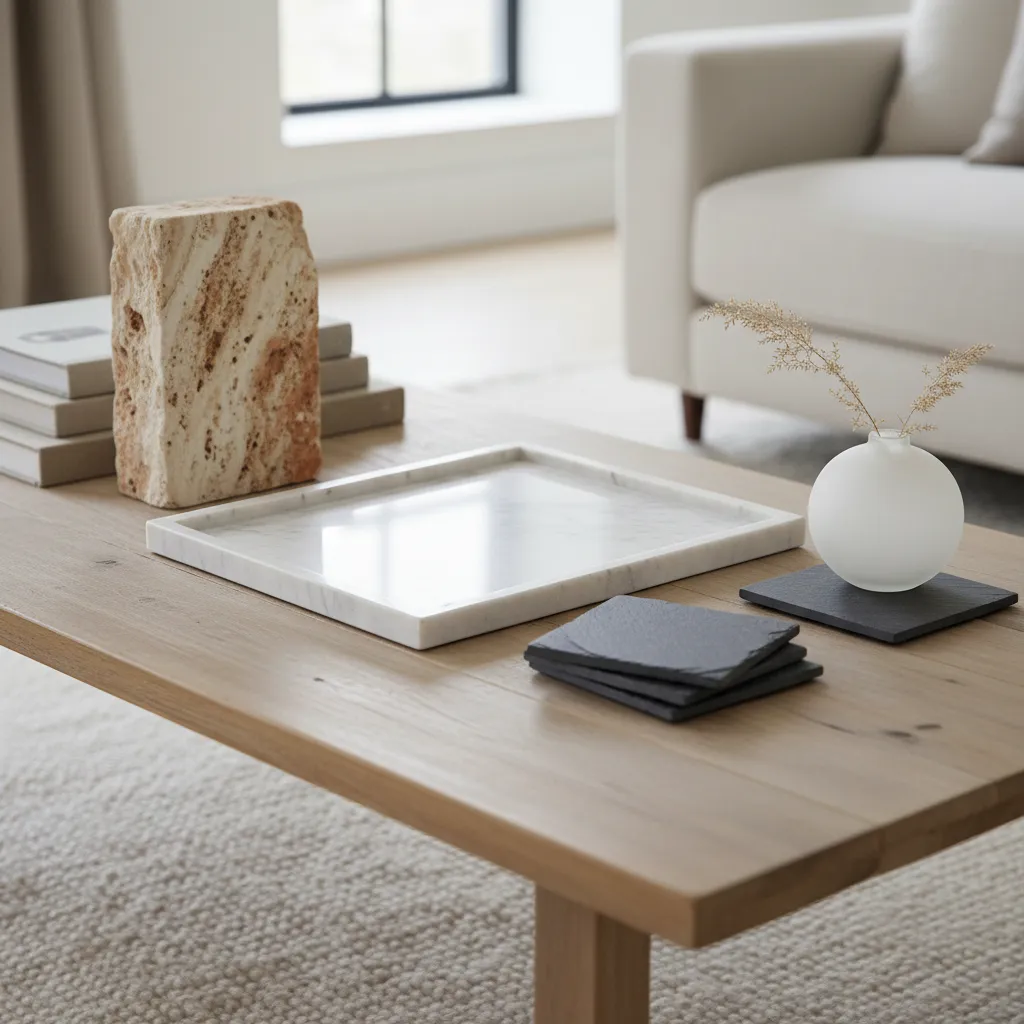 Stone elements bring a cool, grounded texture to your home. You do not need a massive marble fireplace to get this look. Small touches work perfectly. Add a marble tray to your coffee table, display a raw travertine bookend, or use slate coasters. These hard, organic surfaces provide excellent contrast against soft upholstered furniture.