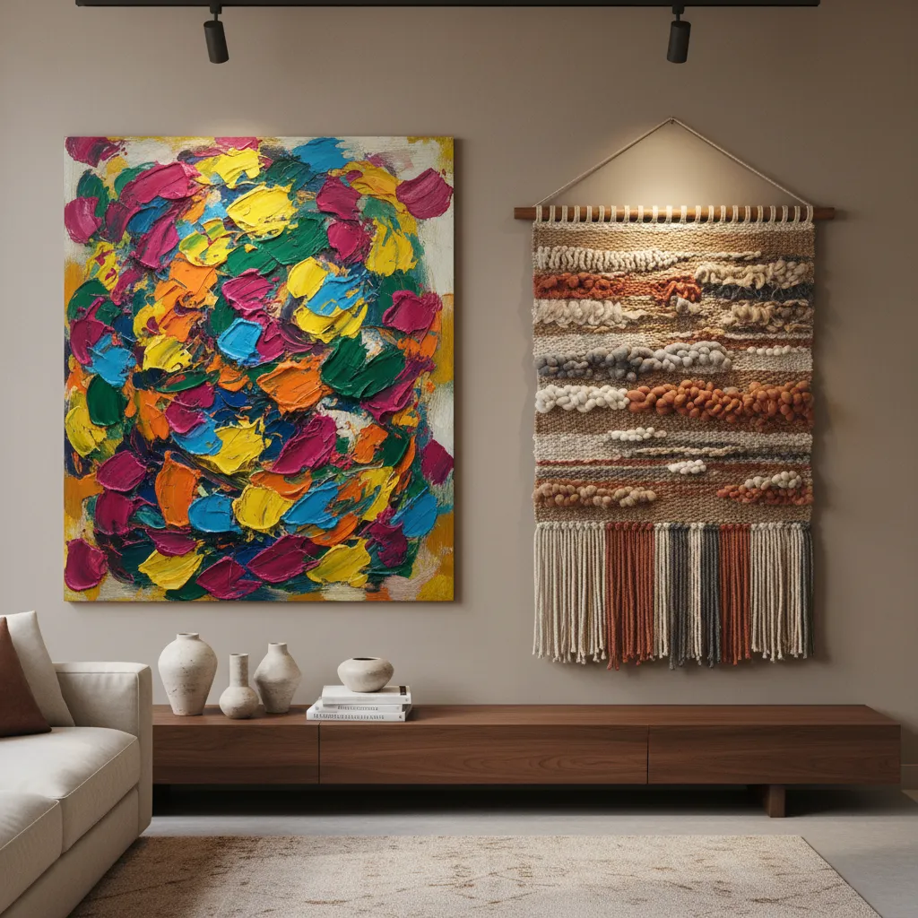 Walls need texture, too. Flat paint and standard framed prints can only do so much. Consider hanging woven wall hangings, textured canvas paintings with thick acrylic strokes, or even a framed piece of vintage fabric. If you want to go bigger, explore Living Room Wall Transformations that use wood paneling or textured wallpaper.