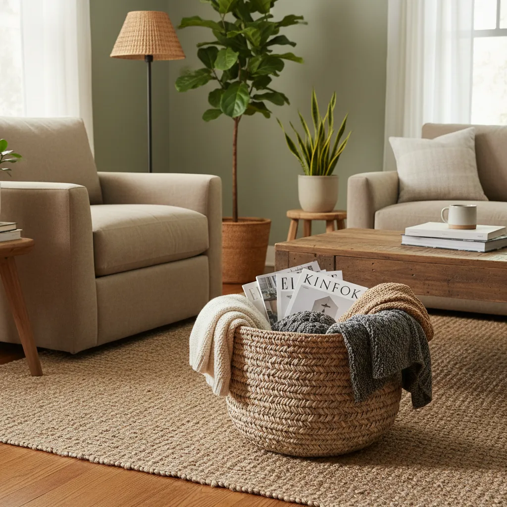 Woven materials like rattan, seagrass, and jute instantly add a cozy, natural element to any room. Instead of using plastic bins, toss your extra blankets or magazines into a large woven basket. The braided texture breaks up the straight lines of your furniture and adds a relaxed, earthy vibe.