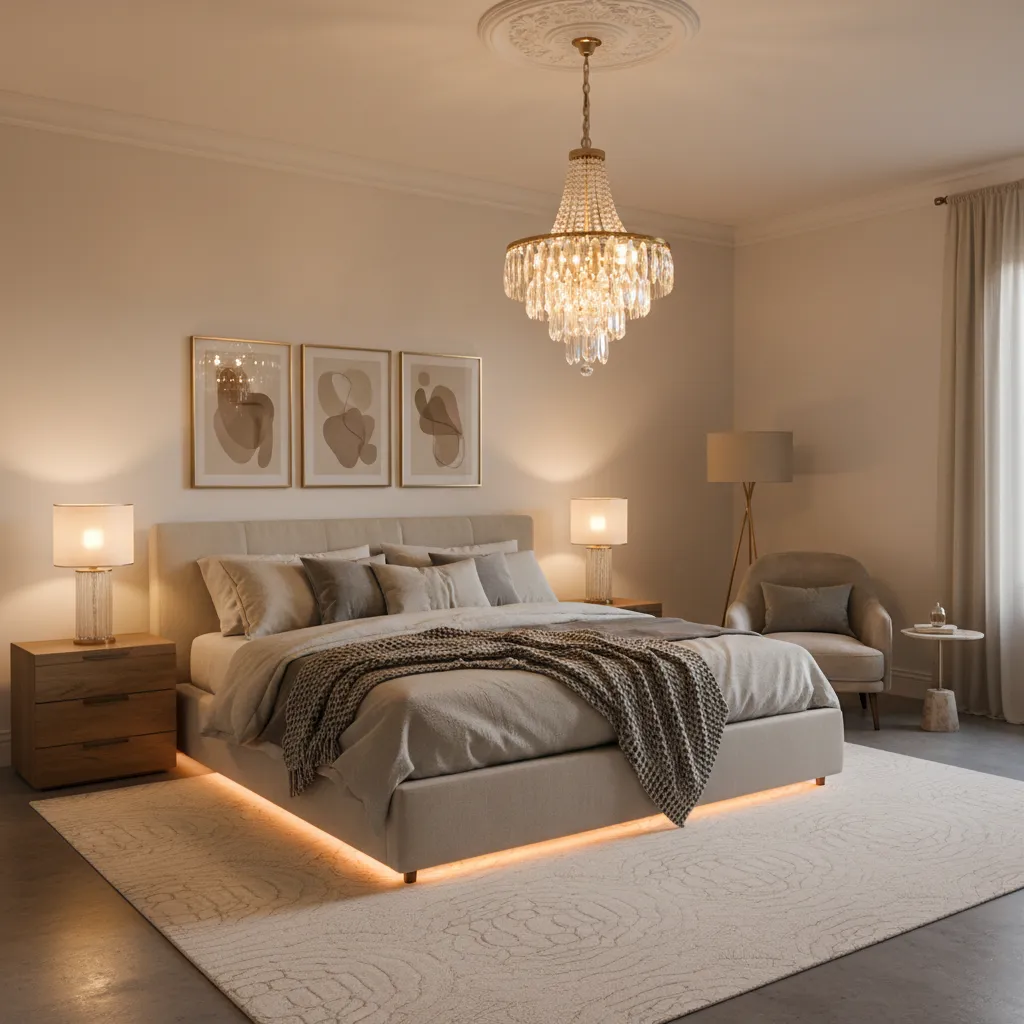Layered lighting is essential—combine ambient lighting (ceiling lights), task lighting (bedside lamps), and accent lighting (LED strips or wall sconces). Soft, warm light creates a cozy and inviting environment while highlighting key design features.