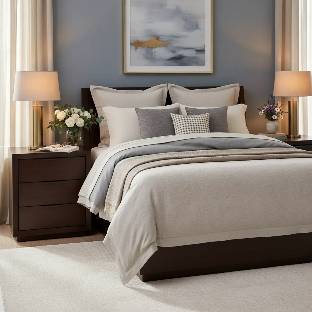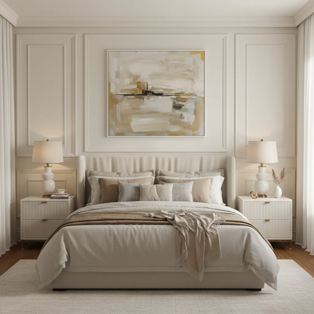Invest in a comfortable bed with an upholstered headboard, elegant nightstands, and a cozy seating area if space allows. Accessories like plush rugs, curtains, decorative trays, and artwork complete the look and contribute to a serene, luxurious vibe.