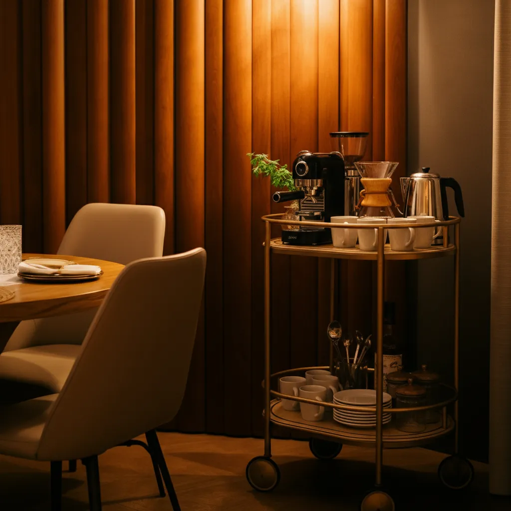 A stylish Coffee cart is both functional and decorative. Stock it with vintage-style glassware, your favorite spirits, and a small plant. It adds a touch of glamour and is perfect for entertaining.