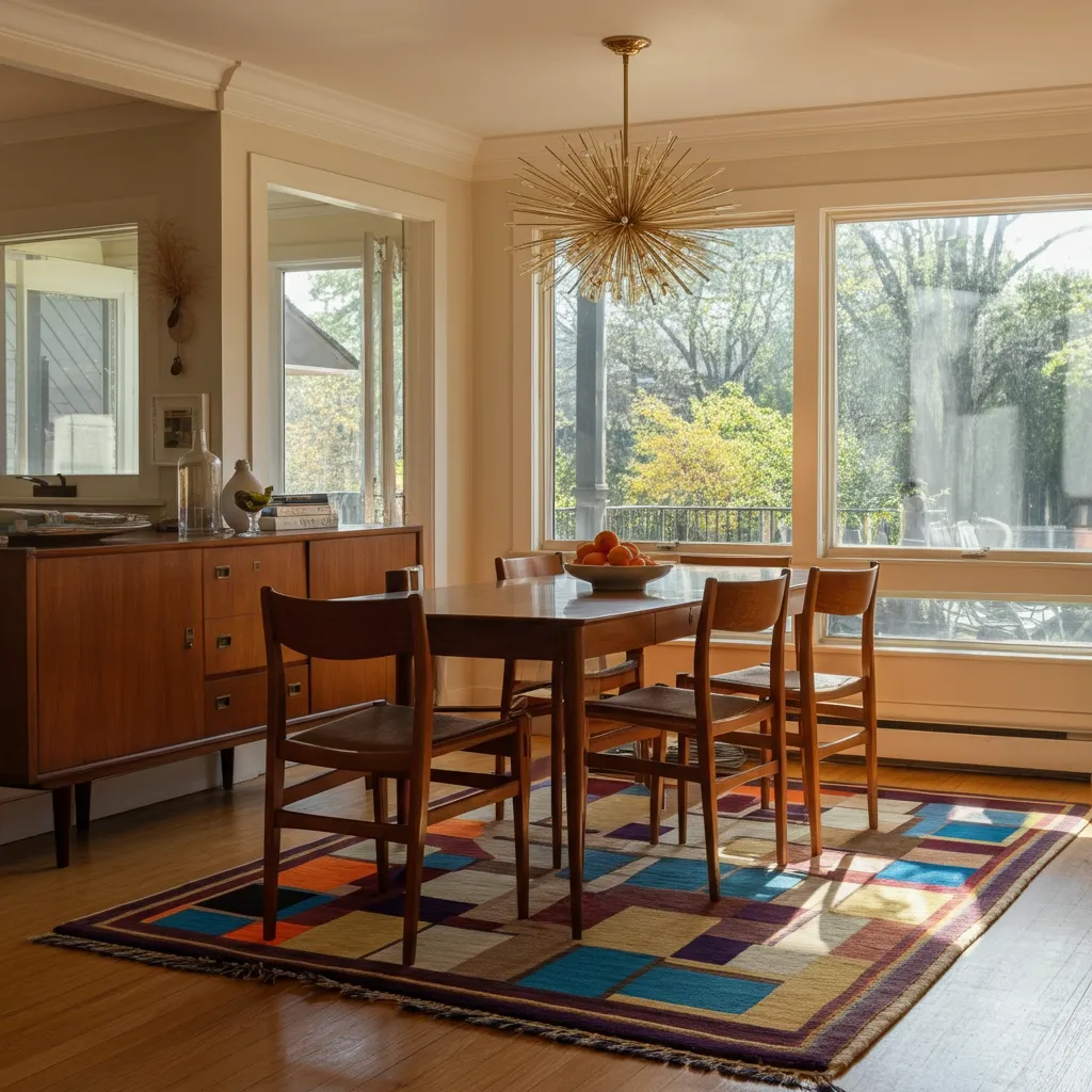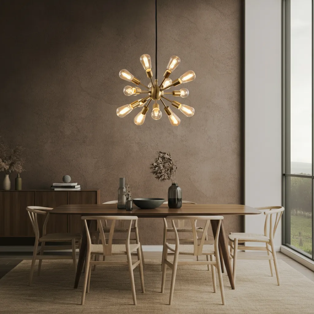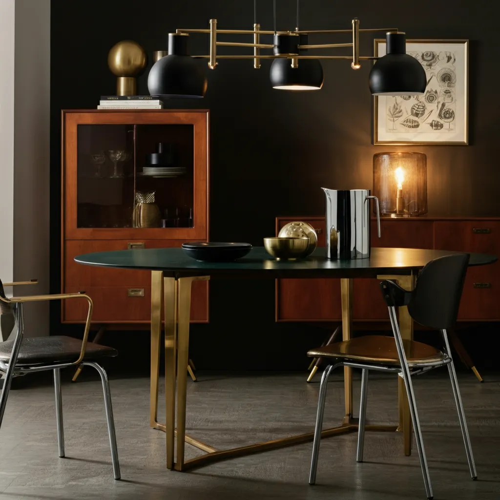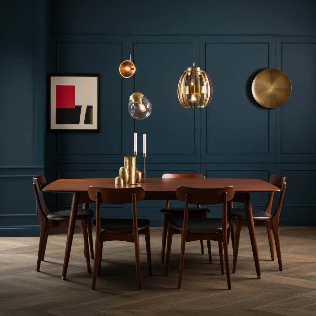 Lighting in a mid-century dining room is a key decorative element. A Sputnik chandelier, an oversized globe pendant, or an arc floor lamp can serve as a stunning focal point. Look for fixtures with brass, black, or chrome finishes to complete the aesthetic.