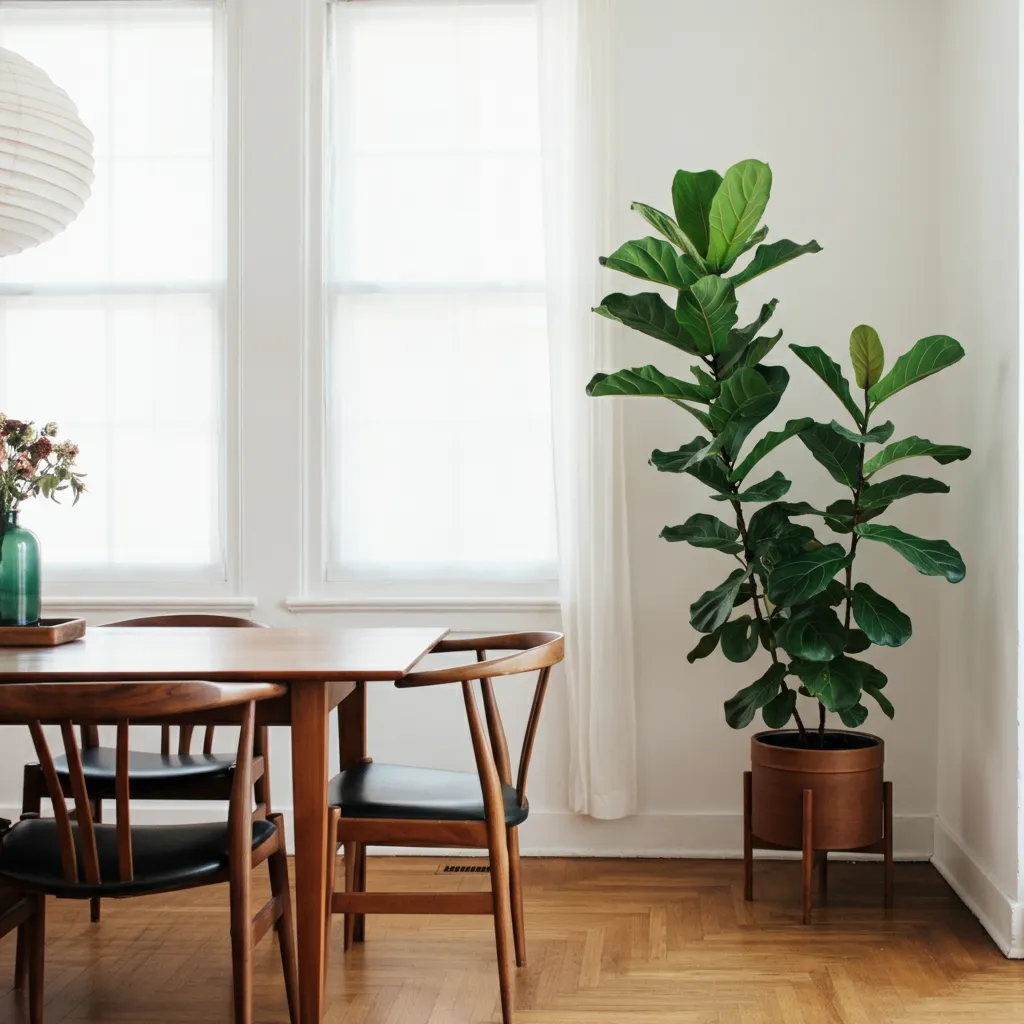 Houseplants are essential to the mid-century modern look. A tall Fiddle Leaf Fig in a corner, a Snake Plant on the floor, or a trailing Pothos on a shelf adds life, color, and an organic element to the room.