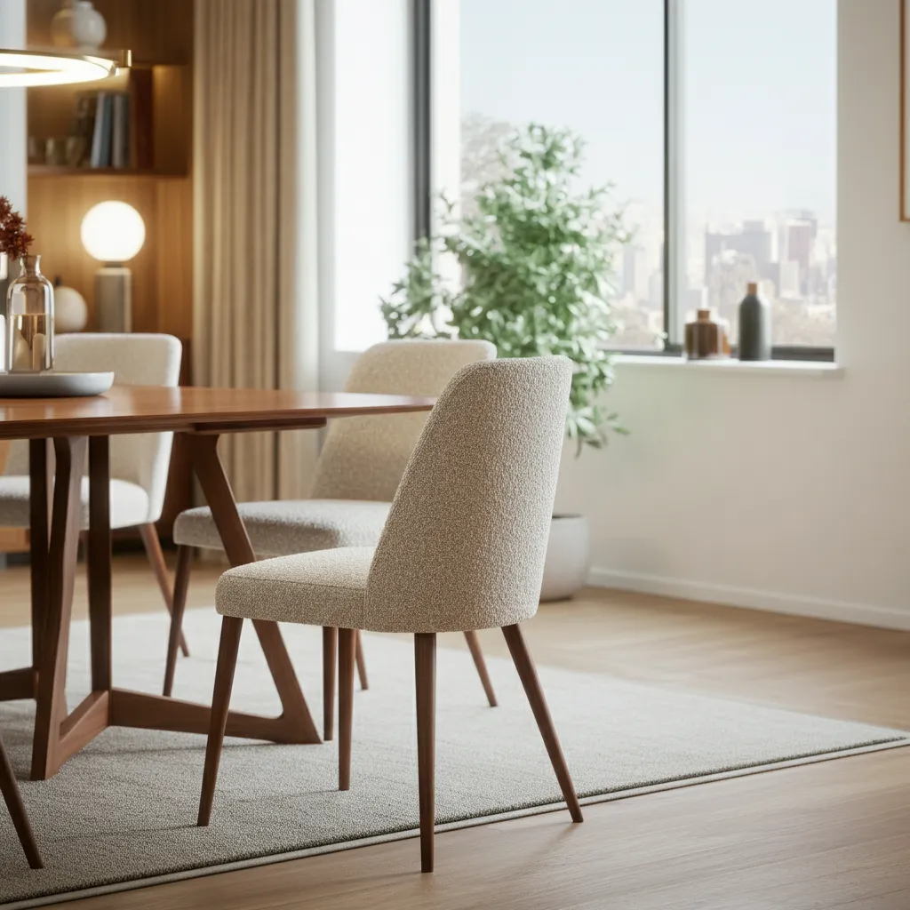 The dining table is the heart of the room. Look for tables with tapered legs, beveled edges, and simple, geometric shapes. Walnut and teak are classic wood choices that bring warmth and a natural feel to the space. A round table can encourage conversation, while a rectangular one offers a more formal, linear look.