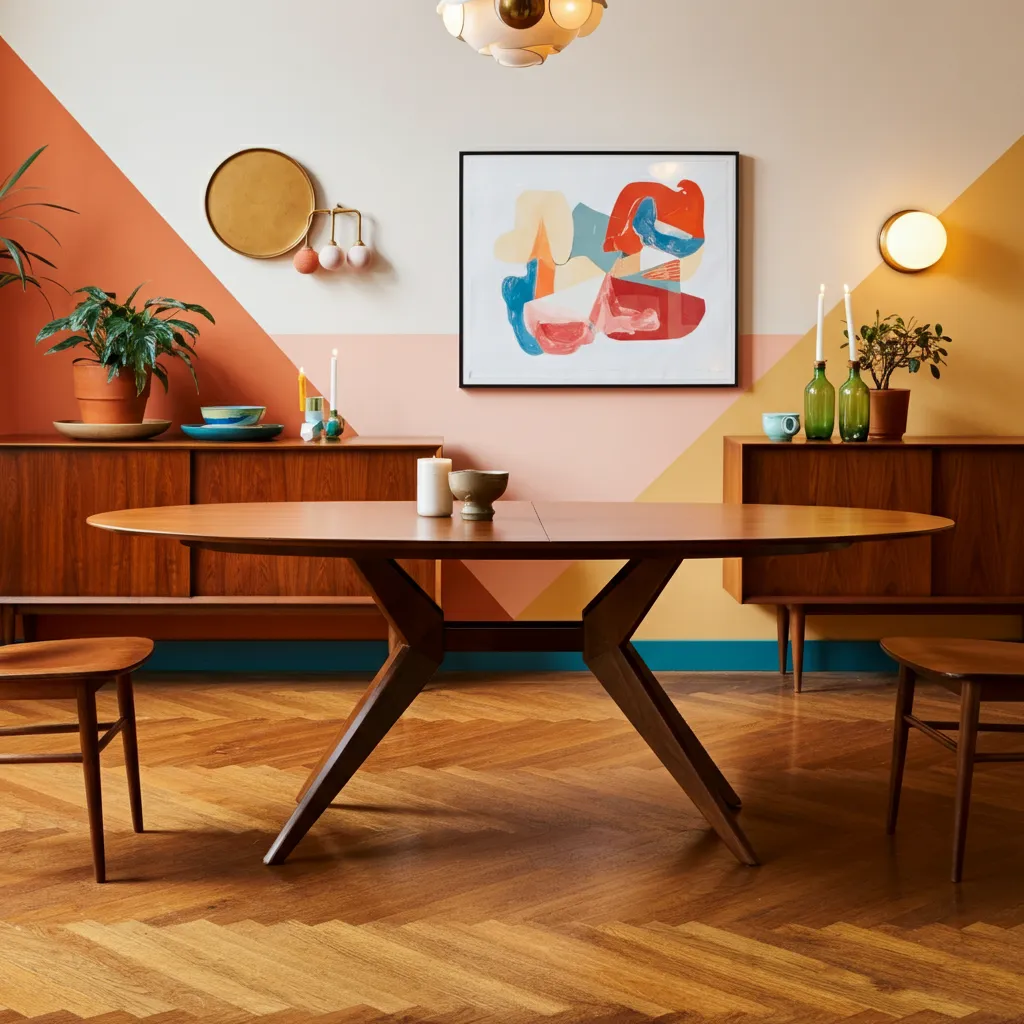Keep the tabletop simple for daily use with placemats that echo mid‑century colors or patterns. For special occasions, add a centerpiece like a sculptural vase, statement lighting above the table, or coordinated tableware to elevate the look without overwhelming the design.