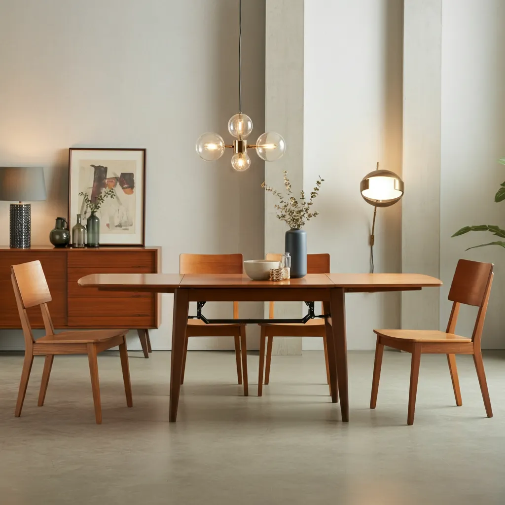 Look for chairs with tapered wood legs, molded seats, or minimalist silhouettes. Upholstered seats in muted fabrics, Eames‑style chairs, and classic wooden designs all complement mid‑century tables beautifully.