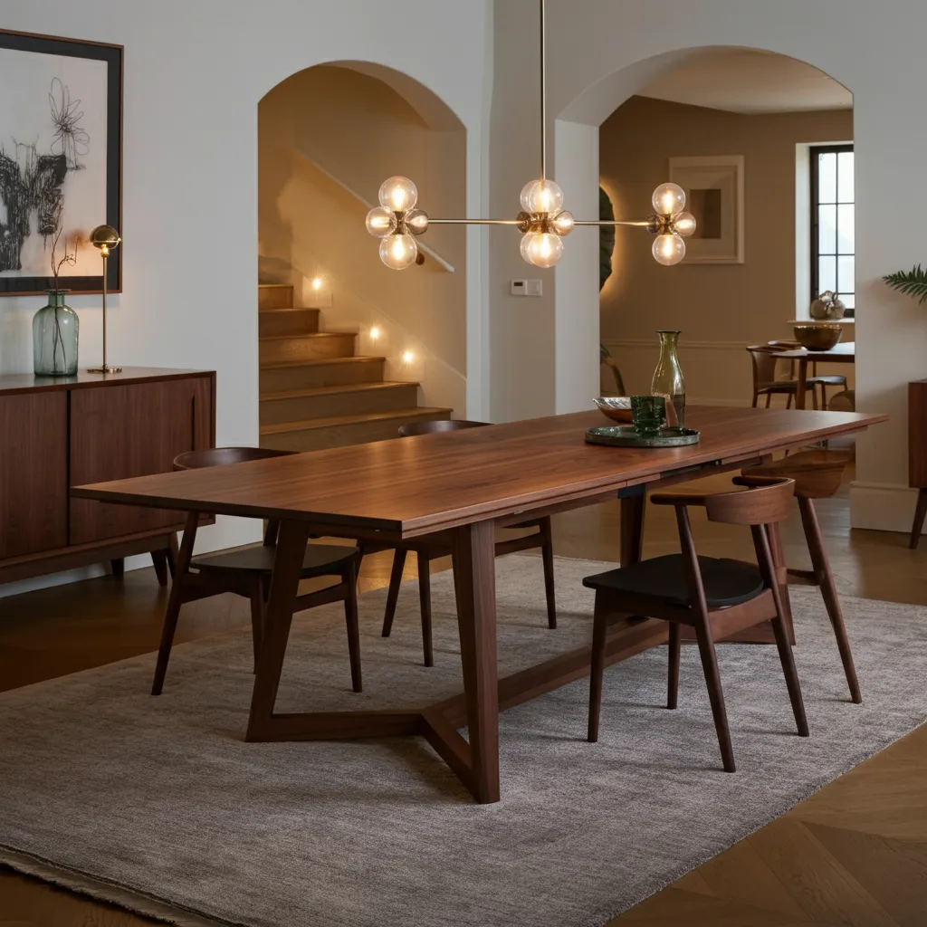 A rich walnut table with a hidden leaf is the ultimate entertainer’s companion. Its deep wood tones add warmth, while the ability to expand makes it perfect for holiday feasts.