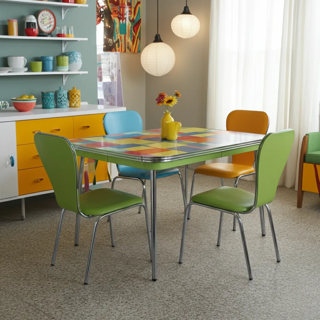 For a retro, nostalgic feel, a table with a durable and colorful Formica top paired with chrome legs is a cheerful and practical choice.