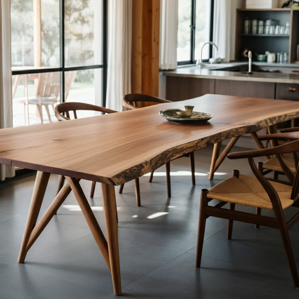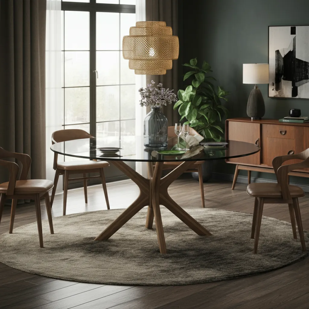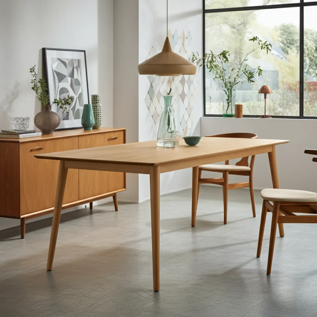 A mid-century modern dining table typically features clean lines, organic shapes, and minimal ornamentation. It often uses warm wood tones like teak, walnut, or oak, and may include tapered legs or subtle geometric details that reflect the classic mid‑century aesthetic.