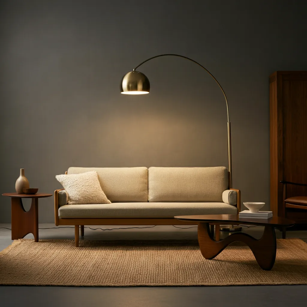 Need light over the sofa but don’t have a ceiling outlet? The oversized arc floor lamp is the classic solution. It provides focused task lighting while adding a dramatic, sweeping curve to the room’s profile.