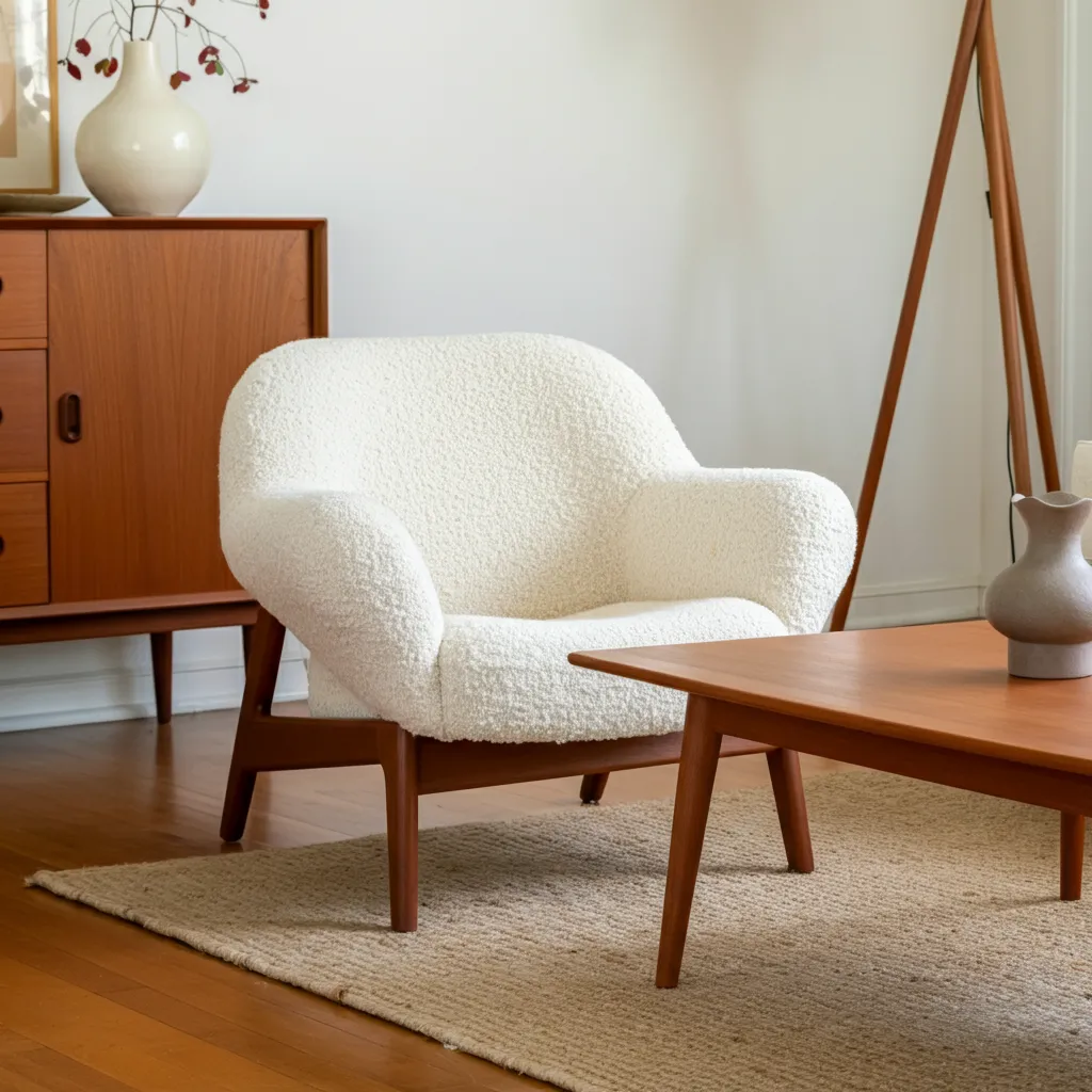 Bouclé (a looped yarn fabric) has made a massive comeback. A creamy white bouclé armchair is like a cloud in your living room. It softens the sharp angles typical of MCM furniture and adds serious cozy points.