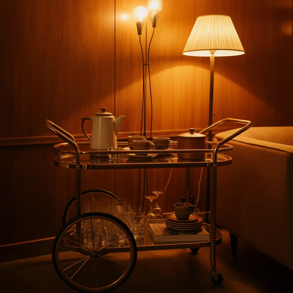 Hospitality was key in the 50s and 60s. Style a brass or wood bar cart with vintage glassware, a few nice coffee cups and pot, and a sugar pot. It suggests that you are always ready to welcome a guest with a coffee and a chat.