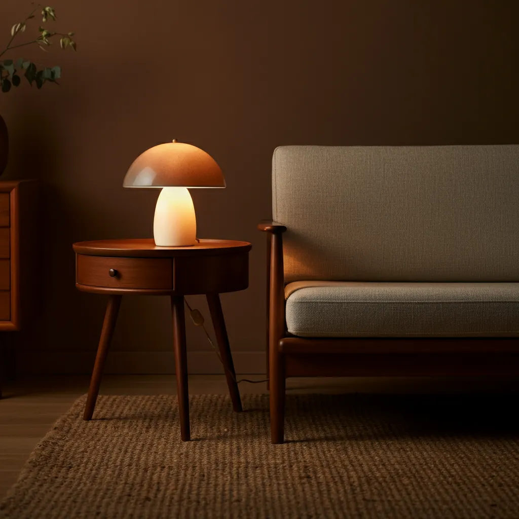 For a softer, ambient glow, place a mushroom-shaped lamp on a side table. Their domed shades cast light downward, creating moody, cozy pockets of light perfect for movie nights.