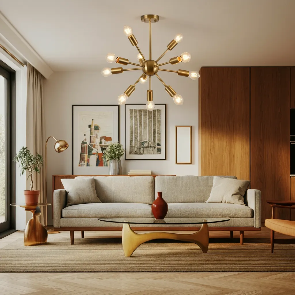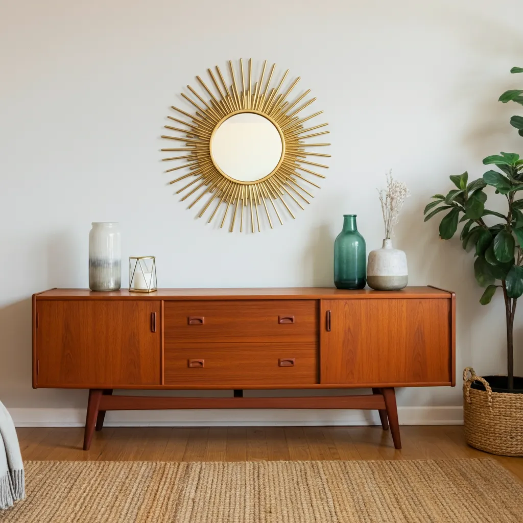A gold or brass sunburst mirror is a classic mid-century staple. Place it above a console table or fireplace to reflect light and open up the room. It acts as a focal point that feels sunny and optimistic.
