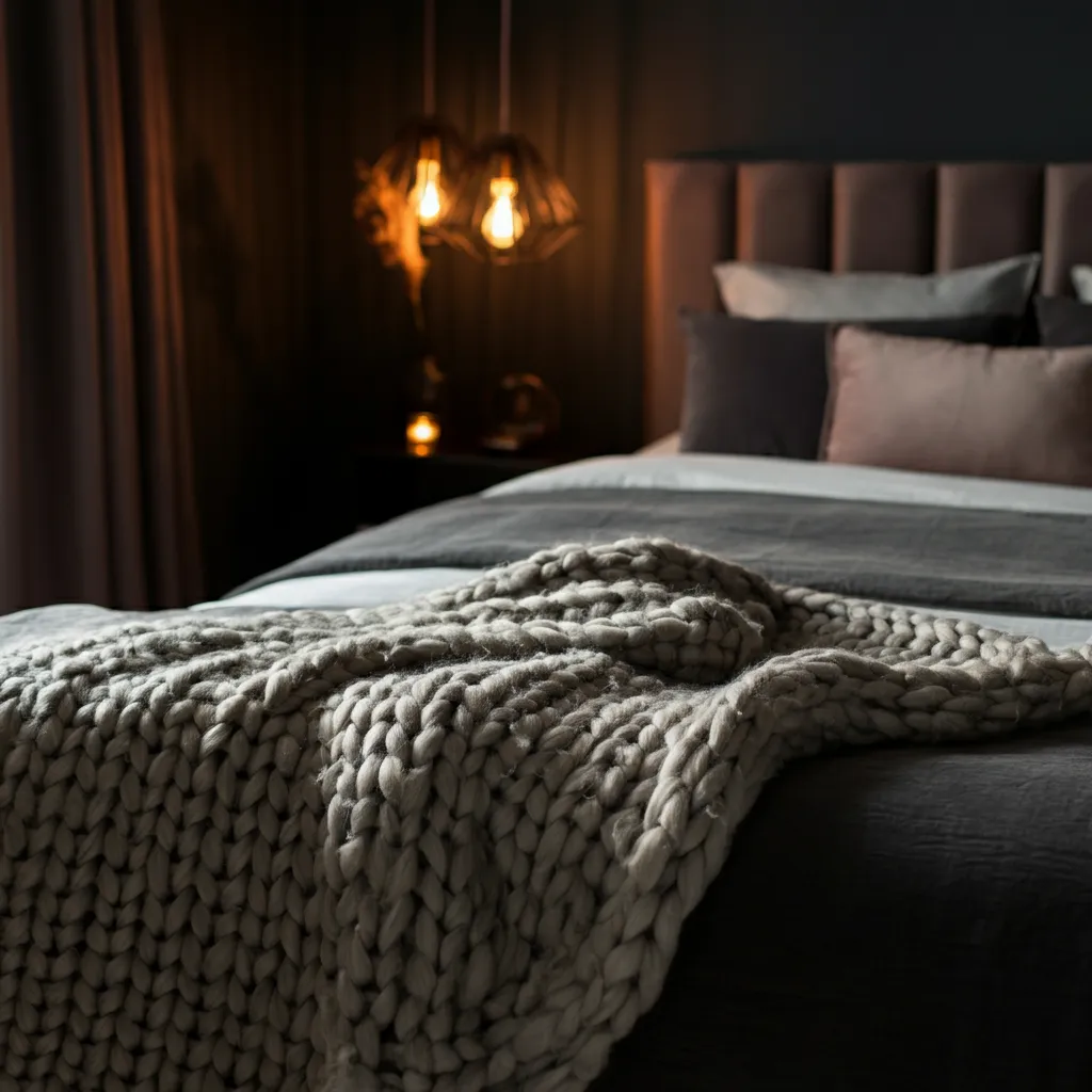 A thick, chunky knit blanket at the foot of the bed adds a layer of cozy texture. It’s perfect for snuggling under on a cool evening.