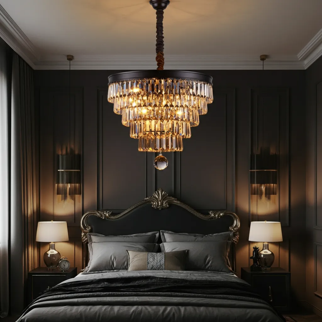 A chandelier adds instant glamour and serves as a beautiful centerpiece. Choose one with a dark finish, crystals that refract light softly, or even a design with candelabra-style bulbs.