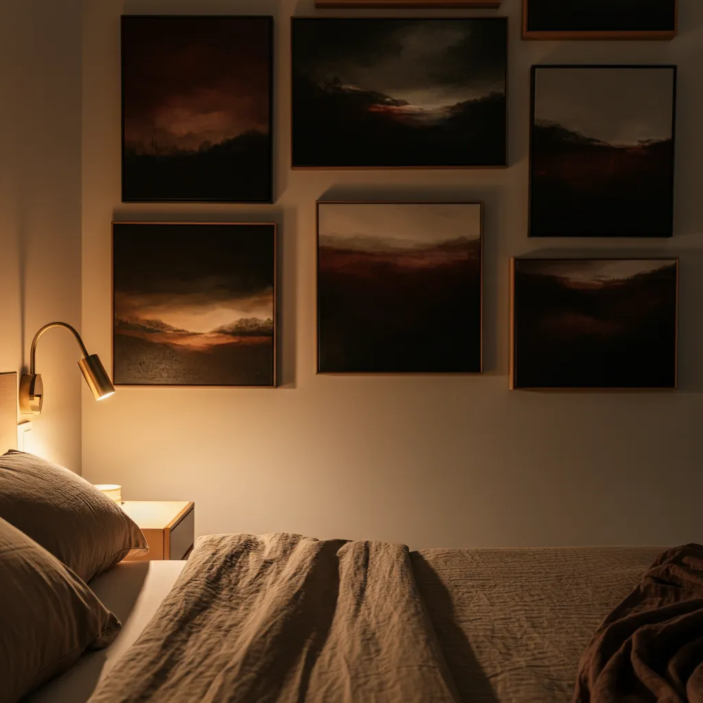 Select artwork that speaks to you. Abstract pieces with deep colors, moody landscapes, or black-and-white photography are excellent choices. Large-scale art can serve as a stunning focal point.
