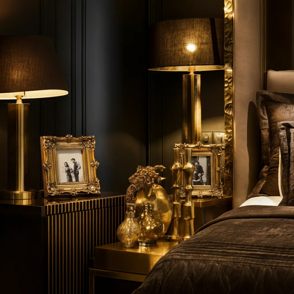 Warm metallic accents like gold, brass, or copper pop beautifully against a dark backdrop. Use them in picture frames, lamp bases, drawer pulls, and decorative objects to add a touch of warmth and sophistication.
