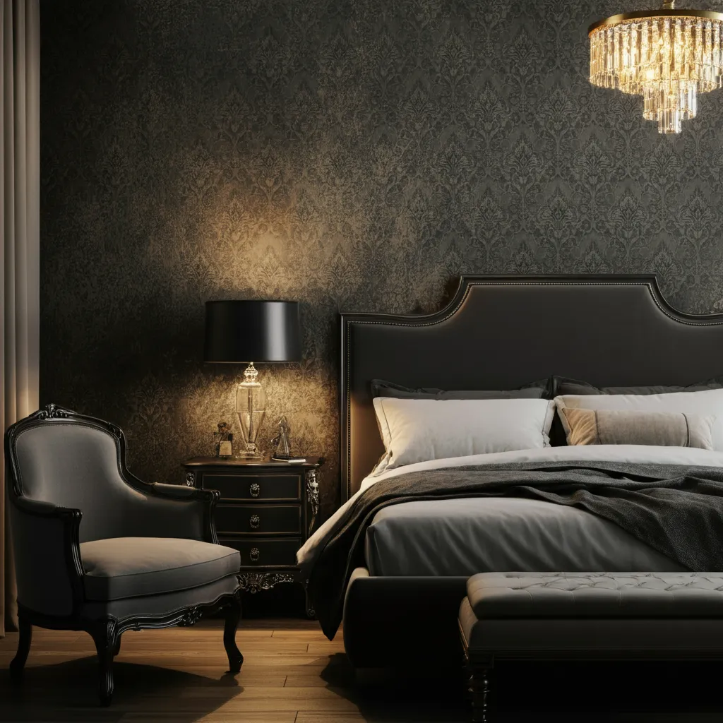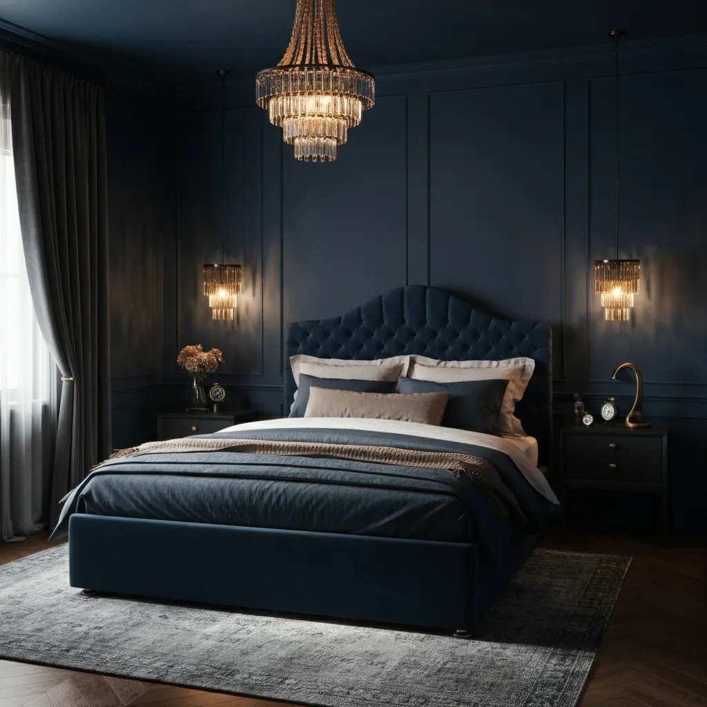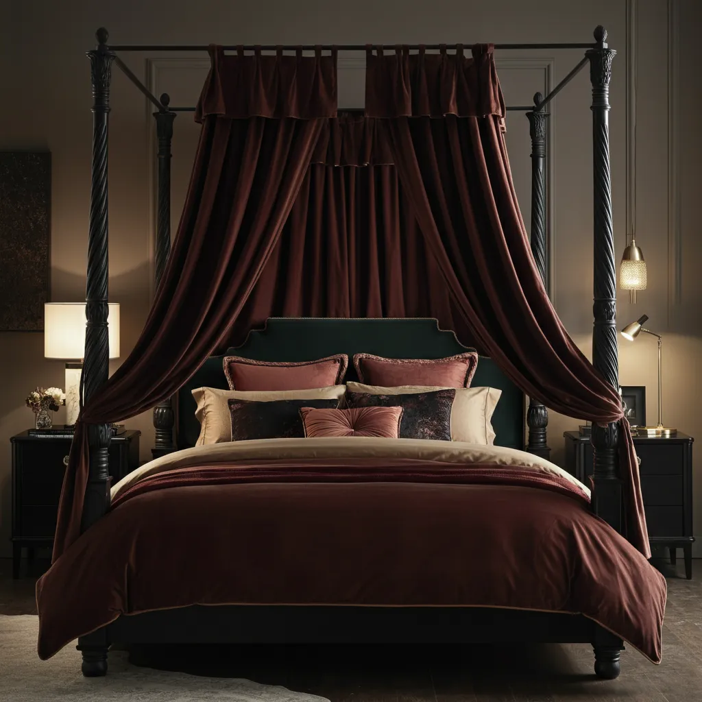 A moody romantic bedroom features deep, rich colors, soft lighting, and luxurious textures. Think dark walls, velvet or silk fabrics, layered bedding, and subtle ambient lighting to create an intimate, cozy atmosphere.