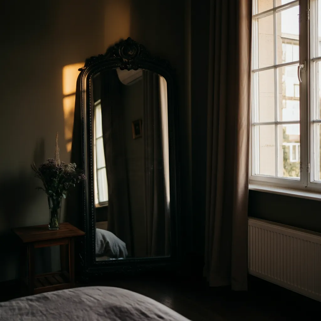 A large, ornate mirror can make the room feel bigger and brighter by reflecting the limited light. Place it opposite a window or a lamp to maximize its effect. A dark or metallic frame will tie it into the overall home decor scheme.
