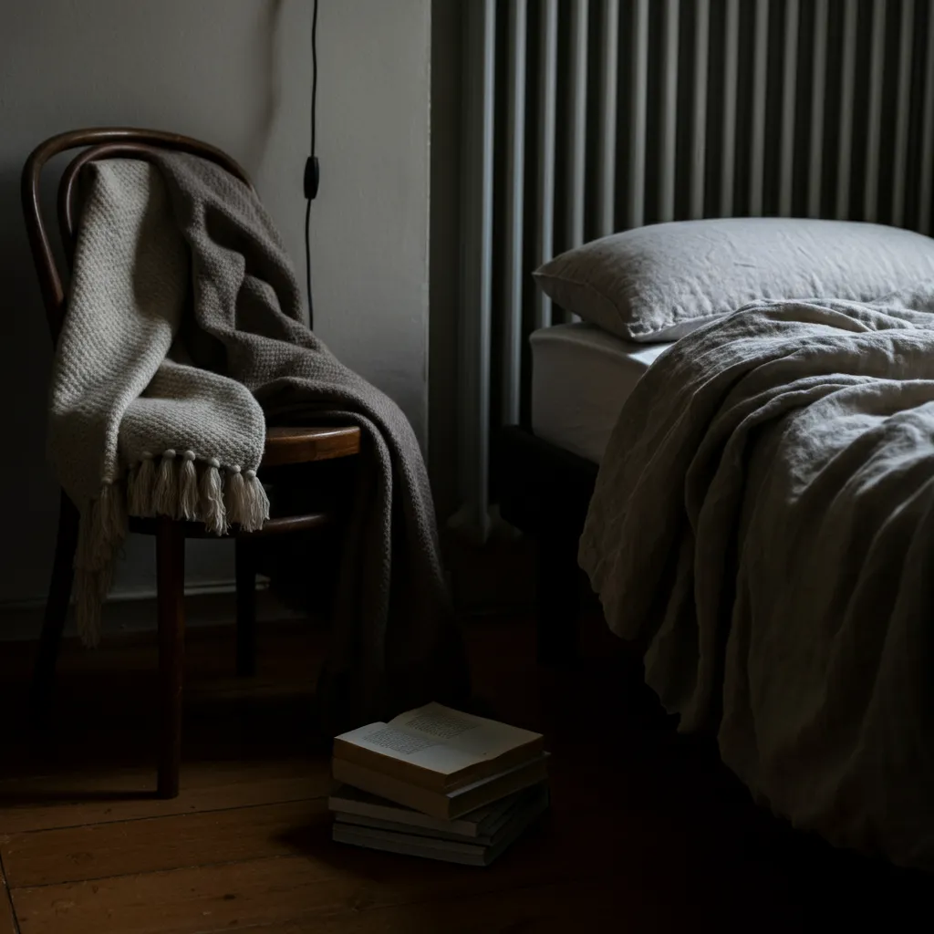 A moody romantic bedroom shouldn’t feel like a museum. A casually draped throw, a stack of books on the floor, and slightly rumpled linen sheets add to the lived-in, relaxed charm of the space.