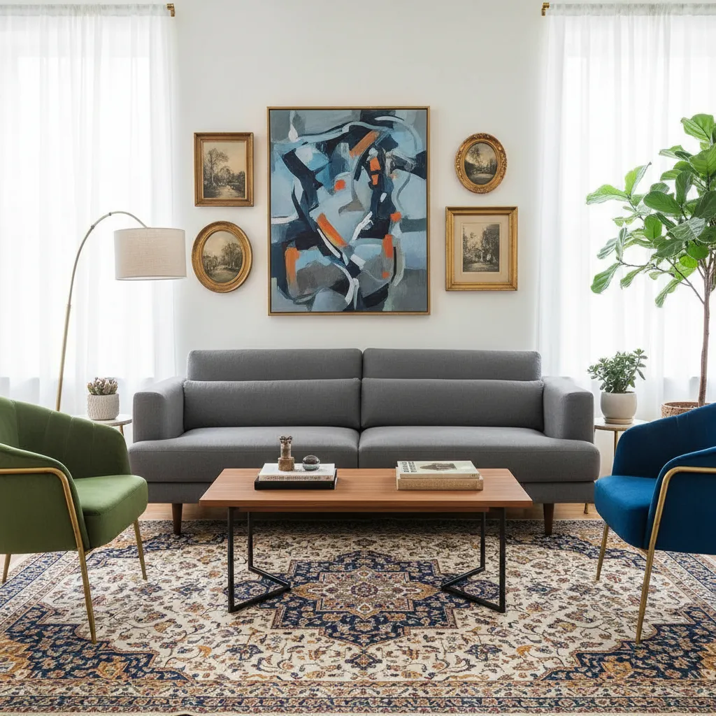 Purchasing a matching sofa, loveseat, and chair set from a big-box store robs your room of personality. A curated, expensive look comes from mixing different pieces that share a cohesive theme. Pair a sleek, modern sofa with two vintage-inspired velvet accent chairs.