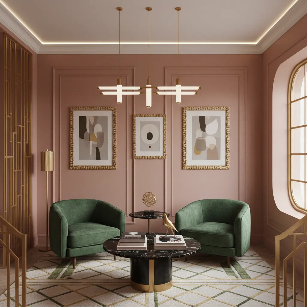 This combination feels simultaneously retro and highly modern. Use dusty rose as your base color on walls or large rugs, and bring in deep emerald green through velvet accent chairs or heavy drapery. The contrast is visually striking but remains soft enough to feel relaxing.