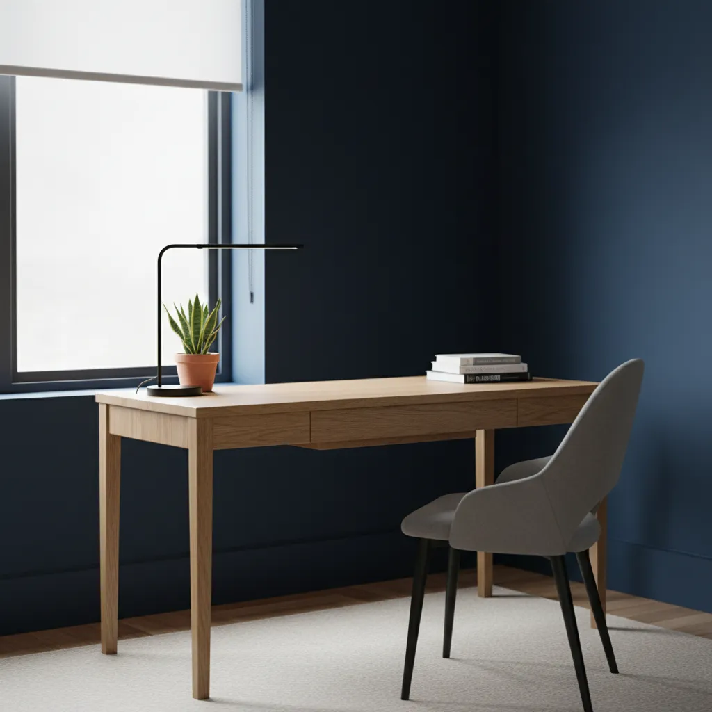 Navy is the color of focus and intellect. It provides a structured, serious backdrop that minimizes visual clutter. Pair navy walls with a light oak desk for a balanced, highly productive workspace.
