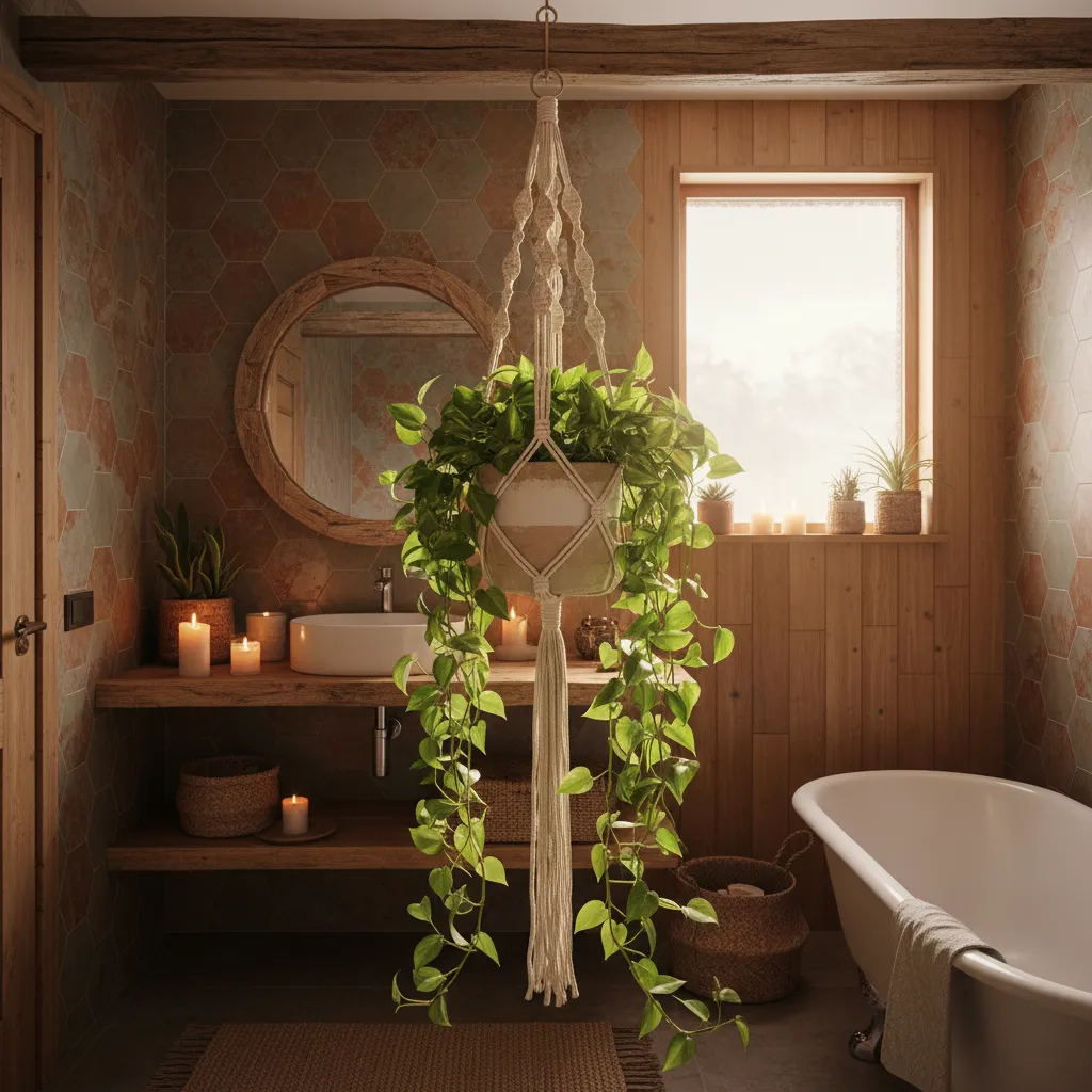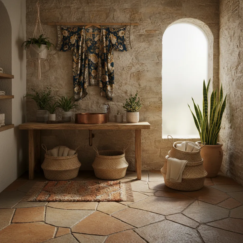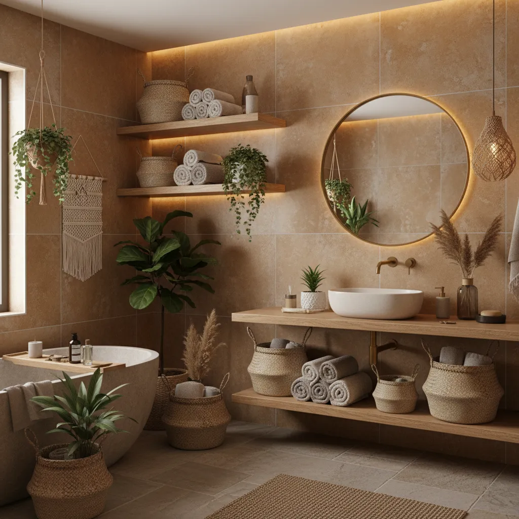 Wooden vanities, wicker baskets, rattan stools, and textured rugs complement the boho aesthetic. Decorative items like macramé hangings, plants, and ceramic accessories enhance charm without sacrificing functionality.
