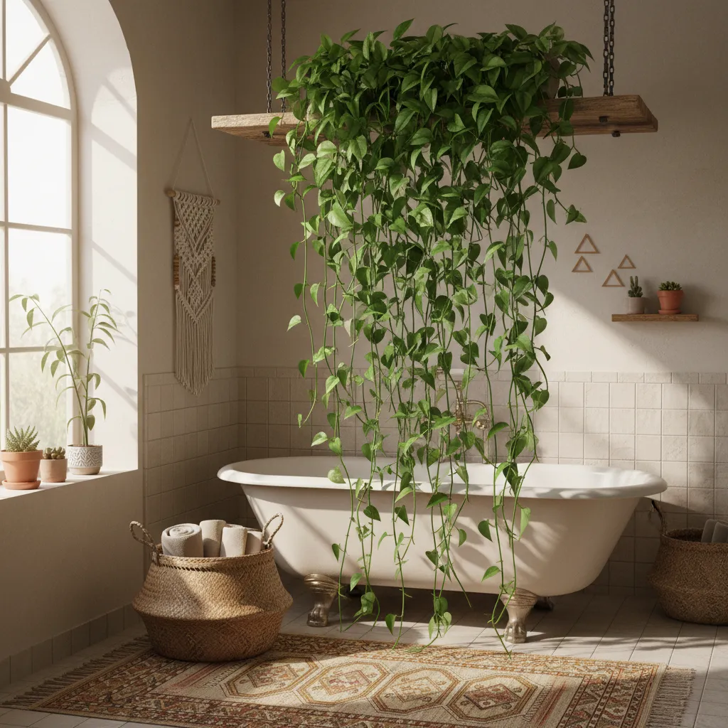 Pothos plants are incredibly hardy and thrive in humid environments. Place one on a high shelf and let the vines trail down towards the floor or drape over a mirror. It creates a lush, jungle-like canopy that feels wildly romantic.