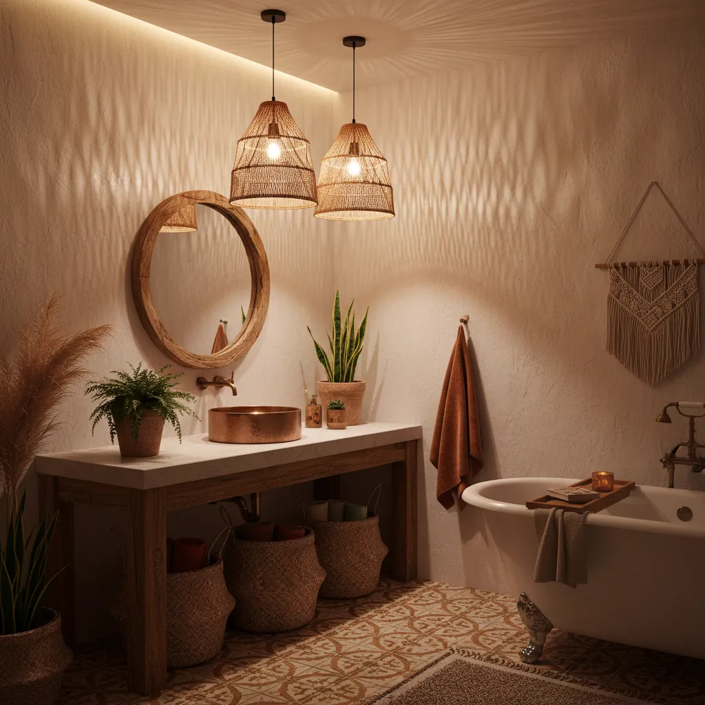 If you have the ability to change fixtures, replace standard vanity lights with rattan or bamboo pendant lights. The woven material casts beautiful, intricate shadows on the walls, instantly adding drama and warmth.