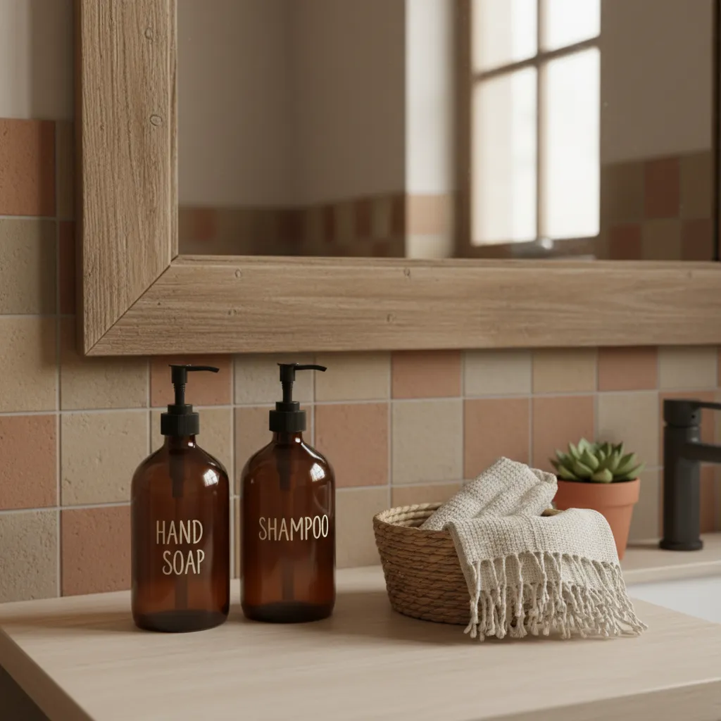 Get rid of branded plastic soap bottles. Decant your shampoo, conditioner, and body wash into matching amber glass bottles. It creates visual uniformity and reduces visual noise, making the space feel calmer.