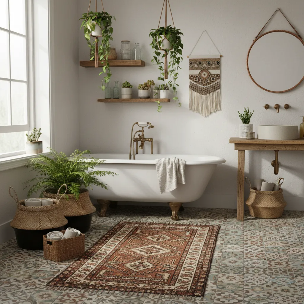 Forget the standard, rubber-backed bath mat. To truly capture the boho vibe, bring in a vintage-style runner or a small Persian rug. The intricate patterns and deep reds or terracottas immediately ground the room.