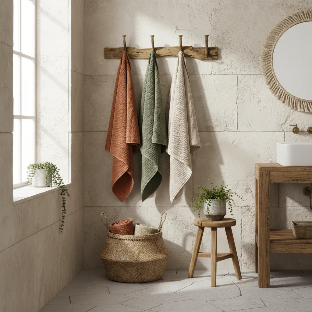Ditch the plush, heavy towels for lightweight waffle weave or Turkish towels. They dry faster (preventing musty smells) and their texture looks beautiful hanging on a hook. Choose earthy tones like mustard, sage, or clay.