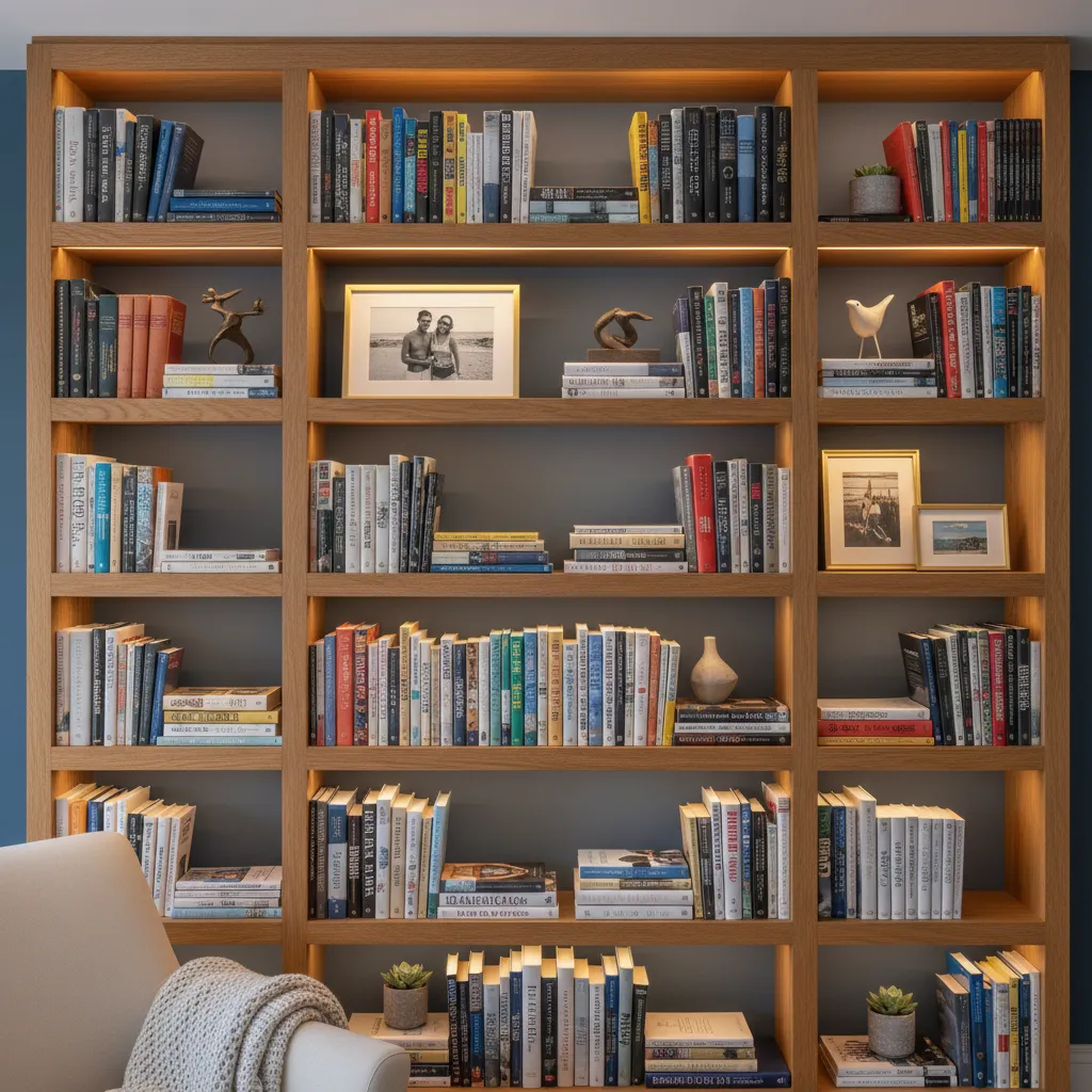 Take everything off your bookshelves and put back only the items you truly love. Mix books (some stacked vertically, some horizontally) with framed photos and small sculptures. Leave empty space so the shelves can breathe.