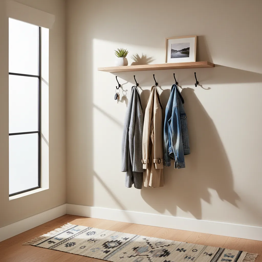 If your front door opens directly into your living room, carve out a dedicated drop zone. Mount a small floating shelf with a few hooks underneath for keys and coats. Add a narrow runner rug to visually separate this new “entryway” from the rest of the room.