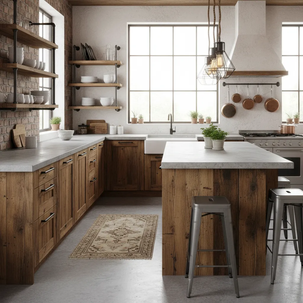 For a truly durable and rustic surface, concrete is hard to beat. It has a raw, industrial feel that ages gracefully, developing a unique patina over time. It pairs exceptionally well with warm wood cabinets, bridging the gap between cold industrialism and warm rustic charm.