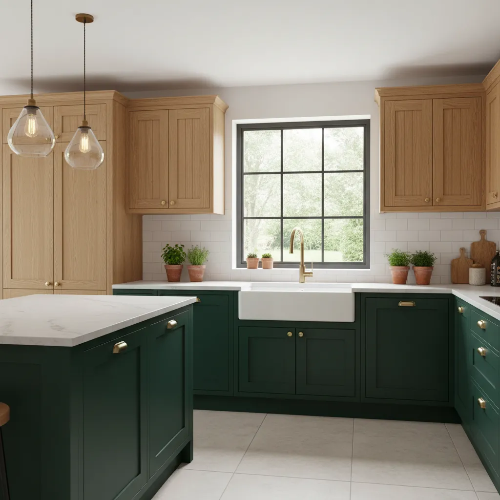 Gone are the days when every cabinet had to match perfectly. A hallmark of rustic modern style is the “unfitted” look. Try painting your lower cabinets a deep, moody green or charcoal while keeping upper cabinets (or open shelving) a natural wood tone. This two-tone approach adds depth and prevents the kitchen from feeling too heavy or too stark.