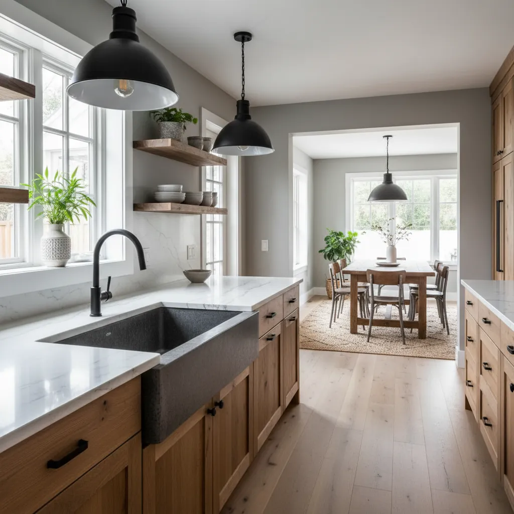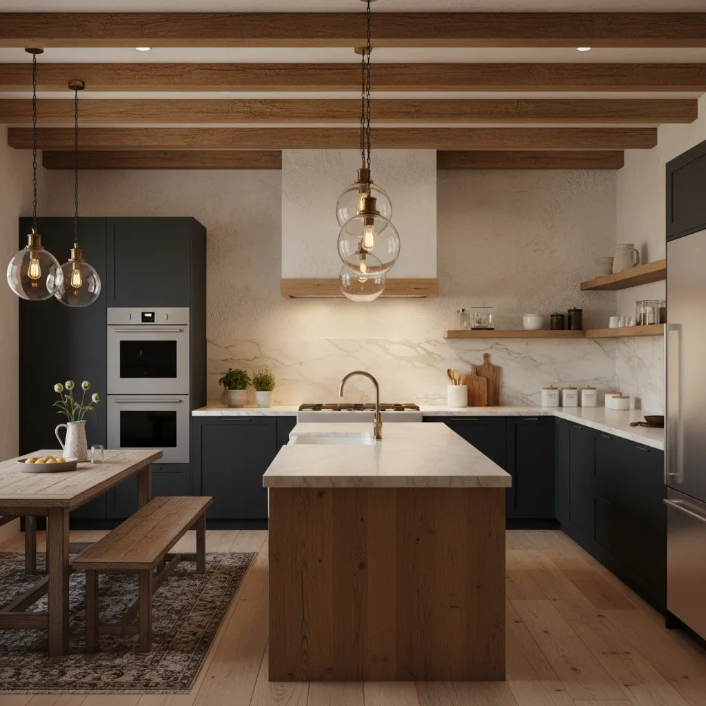 Combine natural materials like wood, stone, and metal with modern finishes such as quartz or concrete countertops. Matte or sleek cabinet finishes paired with reclaimed wood elements balance rustic charm with contemporary style.