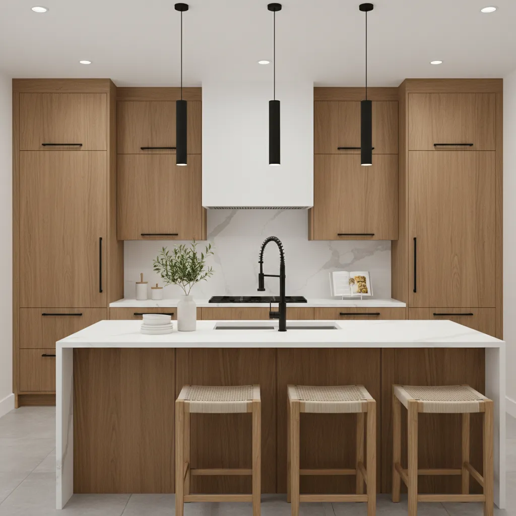 Modern design loves clean lines, and nothing achieves that better than matte black fixtures. Swap out shiny chrome or brushed nickel for matte black cabinet pulls, faucets, and light fixtures. This dark hardware acts as a sophisticated counterpoint to warm wood tones, grounding the cabinetry and adding a touch of industrial chic that feels very current.