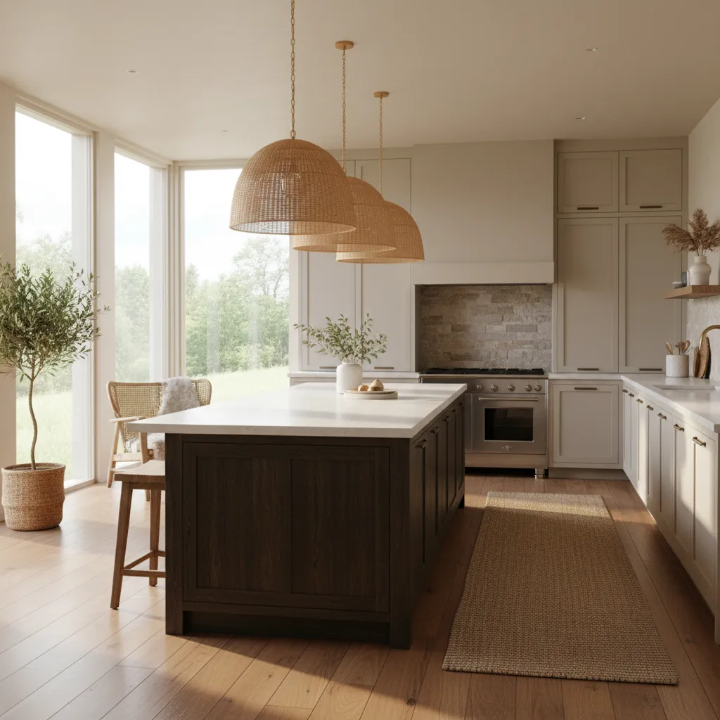 Don’t underestimate soft furnishings in a kitchen. Bar stools with woven leather seats, rattan pendant lights, or a jute runner rug can soften the hard surfaces of appliances and stone. These natural fibers bring in that essential “cozy” factor, making the kitchen feel less like a workspace and more like a gathering place.