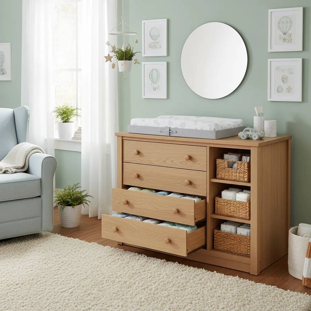 Maximize space by using a dresser as a changing table. Secure a changing pad on top, and you have storage for diapers and clothes right where you need them. As the baby grows, remove the pad, and you have a piece of furniture that lasts for years.
